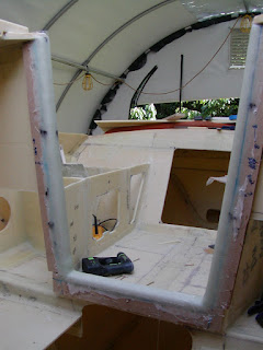I've also been working on the cockpit coaming compartments. As mentioned on other blogs, these compartments seem intended to drain into the under-seat compartment and then out. Well on my boat I wanted the under-seat compartment to stay dry. To fix this I decided to laminate some foam across the back of the compartment all the way to the coaming top: